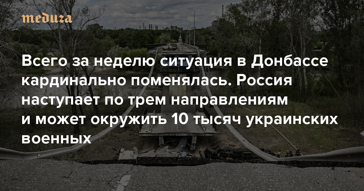 Российская армия через два месяца после официального начала битвы за Донбасс достигла первых значительных результатов в этом генеральном сражении войны. После множественных провалов на разных направлениях силы самопровозглашенных ЛНР и ДНР, наемники из ЧВК Вагнера и официальные войска РФ смогли прорвать оборону у Попасной в Луганской области. Они вышли в тыл крупной — около 10 тысяч человек — украинской группировки в Северодонецке и Лисичанске (эти два города, в каждом из которых живут около 100 тысяч человек, разделены рекой Северский Донец).