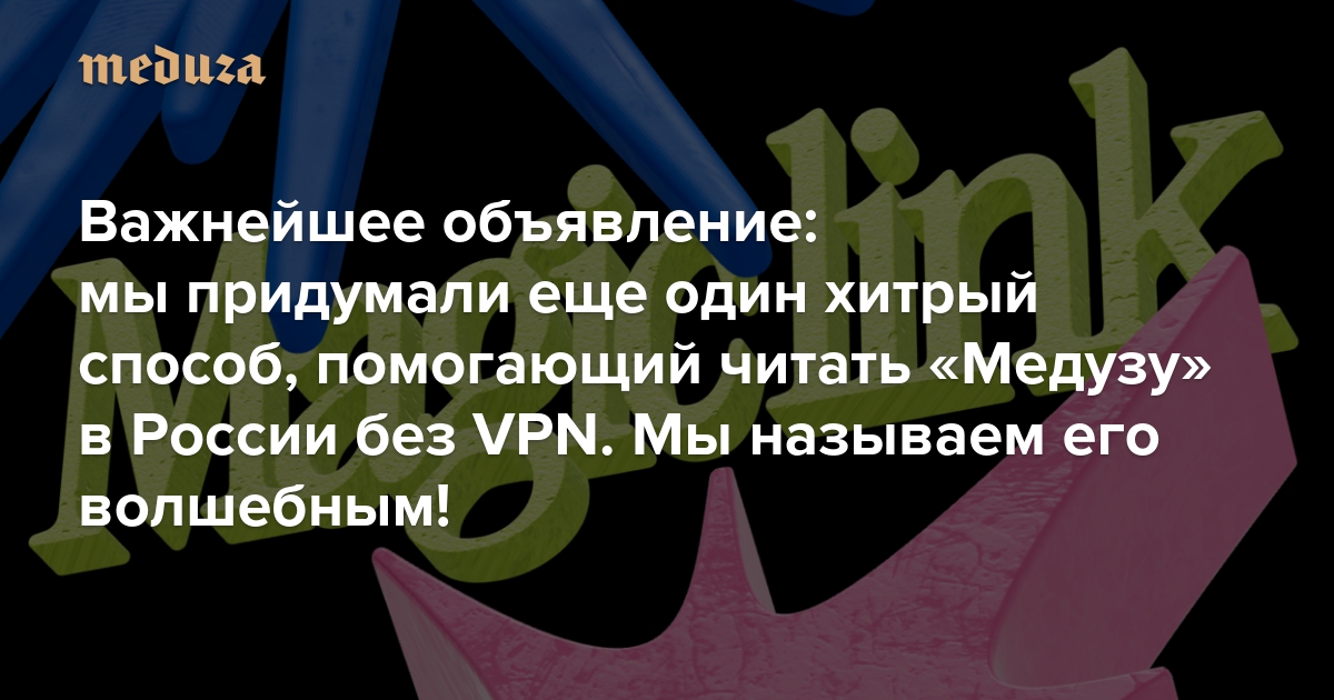 Если вы сейчас находитесь в России и читаете этот текст, вы молодец! Ведь это значит, что вы умеете обходить блокировки. Может быть, у вас стоит работающий (что важно) VPN; может быть, вы знаете, на каких платформах открываются тексты заблокированных сайтов (например, в телеграме); а может быть, вы просто скачали наше приложение (которое само обходит блокировки). Тем не менее таких, как вы, не так уж много. К сожалению для нас и к радости для властей, блокировки работают. Поэтому каждый новый способ, помогающий разблокировать «Медузу» в России, невероятно важен. Итак, встречайте: Magic Link! Они же — волшебные ссылки.
