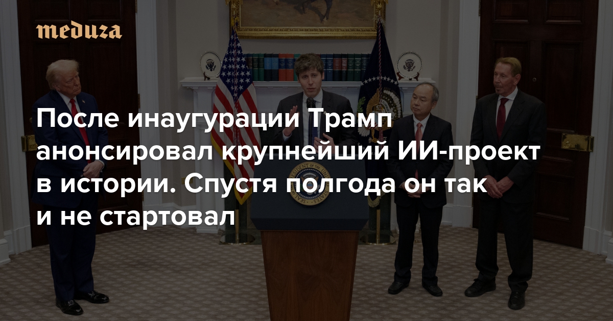 21 января 2025-го, на следующий день после своей инаугурации, Дональд Трамп совместно с руководителями SoftBank, Oracle и OpenAI объявил о запуске крупнейшего ИИ-проекта в истории. В ближайшие несколько лет новая совместная компания Stargate должна привлечь 500 миллиардов долларов инвестиций, чтобы в конечном итоге создать общий искусственный интеллект (AGI). Однако, как пишет The Wall Street Journal, спустя полгода с момента анонса проект фактически не стартовал. Стороны не могут договориться по основным вопросам партнерства, хотя продолжают утверждать, что быстро движутся к намеченным целям. «Медуза» пересказывает главное из материала WSJ, а также рассказывает, что еще придумала администрация Трампа для развития ИИ.