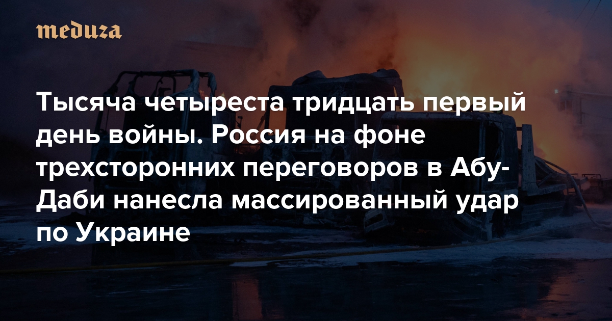 Война Тысяча четыреста тридцать первый день. Россия на фоне трехсторонних переговоров в Абу-Даби нанесла массированный удар по Украине. В Киеве тысячи домов снова без света, в Харькове более 30 пострадавших