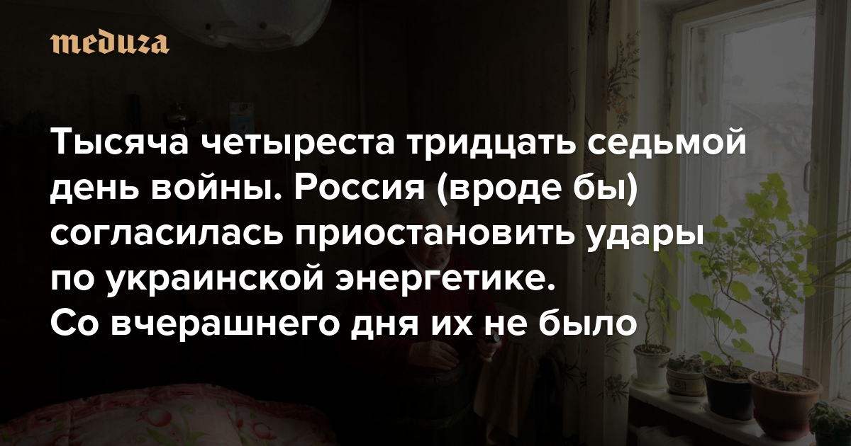 Война Тысяча четыреста тридцать седьмой день. Россия (вроде бы) согласилась приостановить удары по украинской энергетике. Со вчерашнего дня их не было