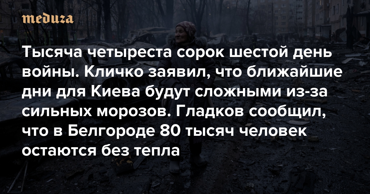 Война Тысяча четыреста сорок шестой день. Кличко заявил, что ближайшие дни для Киева будут сложными из-за сильных морозов. Гладков сообщил, что в Белгороде 80 тысяч человек остаются без тепла